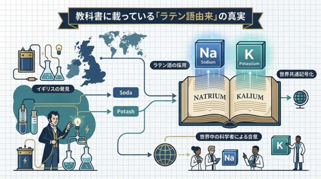そもそも、ナトリウムやカリウムを発見したのはイギリス人の科学者でした。彼は当然、英語で「Sodium(ソジウム)」と名付けました。