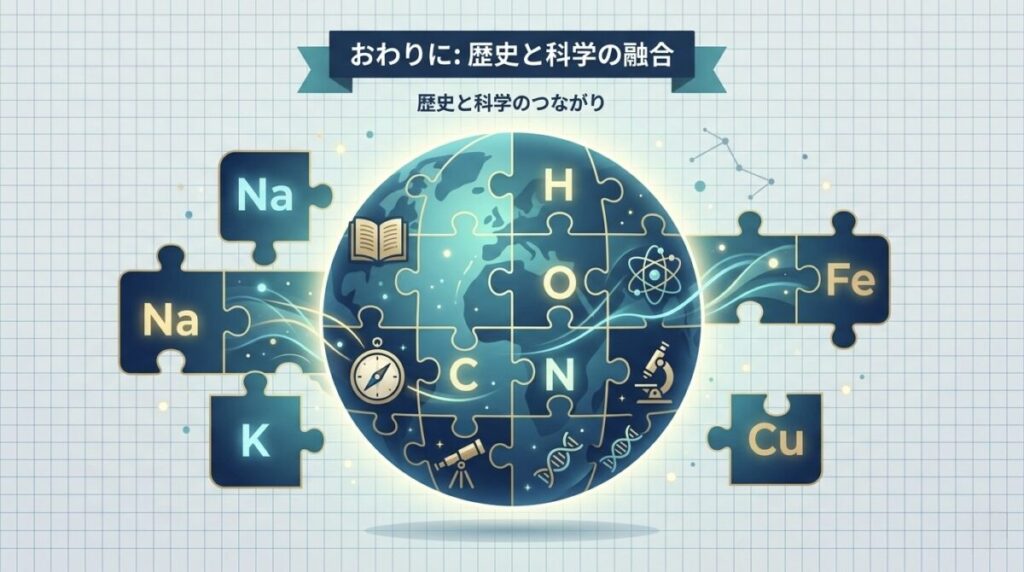 パズルのピースである元素たちは、ただそこにあるだけでなく、私たち人間の歴史や文化と深く結びついています。これからも、そんな化学の裏側に隠された物語を一緒に楽しんでいきましょう。