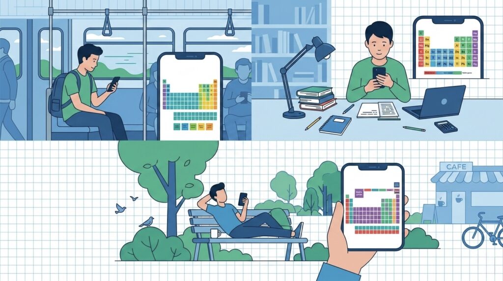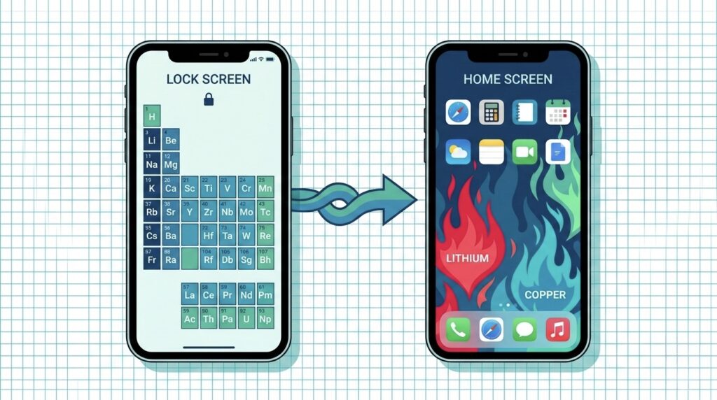 ロック画面で周期表の配置をなんとなく眺め、ロックを解除すると、リチウムの赤や銅の青緑といった鮮やかな炎色反応の写真が飛び込んでくる。文字だけで「銅=青緑」と暗記するよりも、ずっと記憶に残りやすいと思いませんか?
